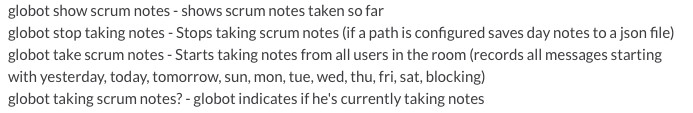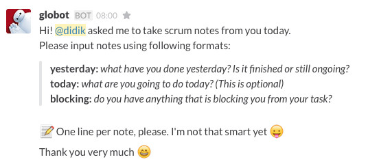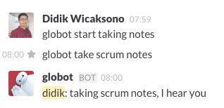 Salah satu tugas Globot adalah mencatat daily scrum meeting. Diawali dengan perintah: