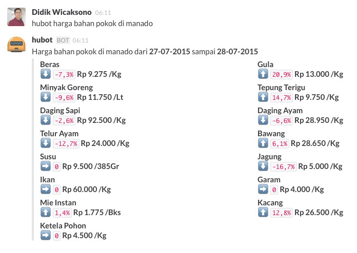 Tidak terbatas untuk kebutuhan internal kantor saja, mungkin juga bisa membuat sesuatu yang terkoneksi dengan API publik? Misalnya saja hubot-bahanpokok yang saya buat untuk menampilkan harga bahan pokok dengan mengambil sumber data terbuka dari blankon melalui situs Kemendag.