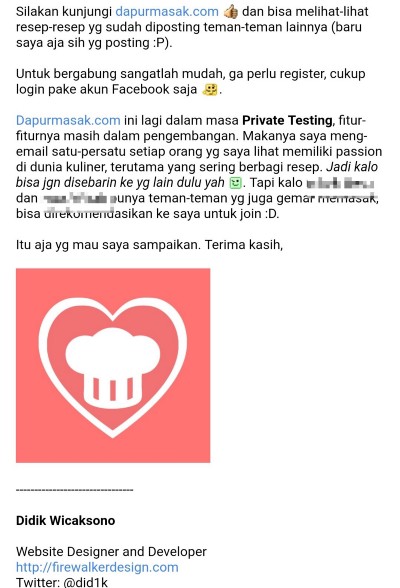 Tiga bulan kemudian, dengan berbekal 20 pengguna dan menambahkan beberapa fitur, saya memberanikan diri untuk membukanya ke publik. Berbeda dengan undangan sebelumnya, ada lebih banyak hal yang bisa saya jelaskan pada surel ini. Mulai dari fitur sampai dengan benefit seperti hadiah. Tapi sebagian besar bergabung untuk mendapatkan teman yang suka masak atau ingin belajar memasak 😊.