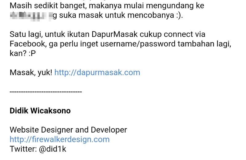 Bisa diperhatikan dari surel di atas bagaimana saya banyak menggunakan emoji (bagi yang belum tahu, dulu GMail emojinya berupa gambar, bukan bagian dari karakter unicode). Ini saya lakukan karena saya takut maksud dan emosi saya tidak tersampaikan. Saya ingin tulisan tersebut mampu mencitrakan DapurMasak sebagai produk yang menyenangkan dan ramah. Dan itu, menurut saya, sulit dicerna dari tulisan saja.