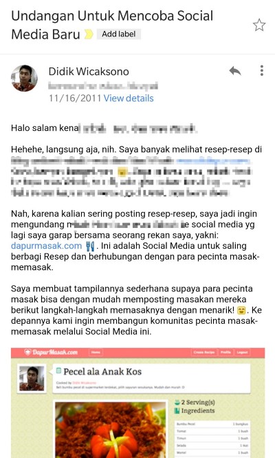 Setelah menggali-gali arsip surel, saya berhasil menemukan surel yang saya kirim untuk mengundang pengguna pertama DapurMasak 🤗. Pada saat itu saya memberinya judul “Social Media Baru”, karena “situs berbagi resep” itu masih cukup asing didengar (sekarang juga sih, ini merupakan pekerjaan rumah buat kami).