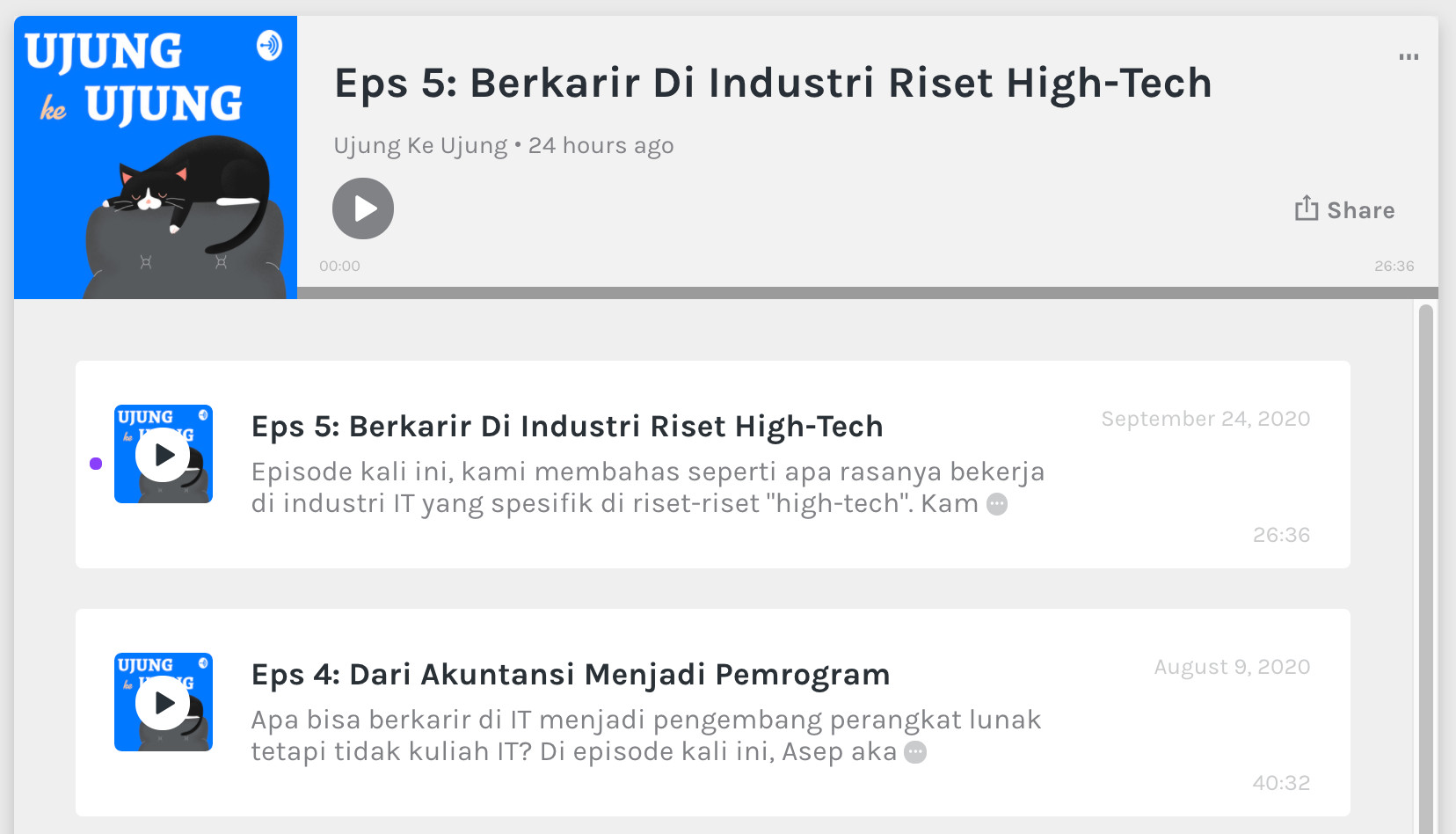Minggu ini saya menambahkan podcast baru bertajuk “Ujung ke Ujung”. Podcast ini digawangi oleh Radita Liem & Asep Bagja dengan mewawancarai berbagai praktisi IT untuk topik-topik yang penting untuk dibahas. Ada banyak episode sudah beredar, untuk selengkapnya kalian bisa mengunjungi ke website mereka 😇.