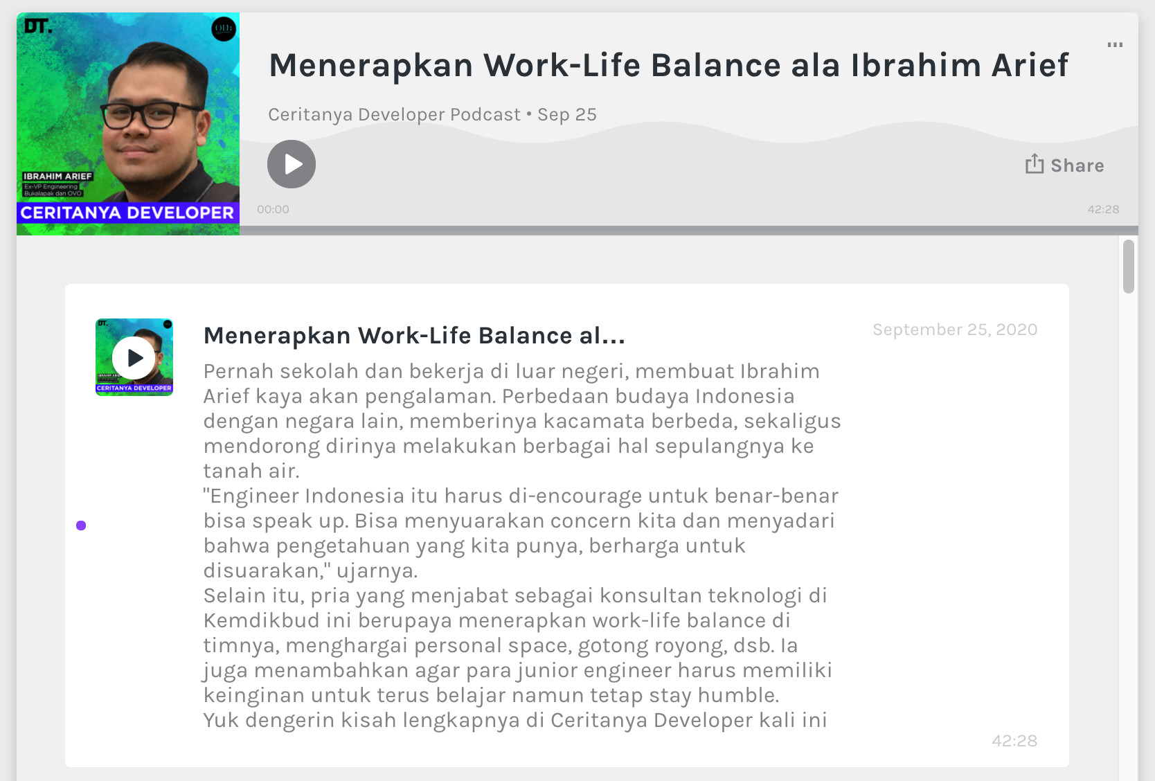 Podcast Ceritanya Developer kedatangan tamu spesial, Ibrahim Arief. Beliau memiliki segudang pengalaman baik di dalam dan luar negeri. Jangan lewatkan episode ini! 🙆♀️