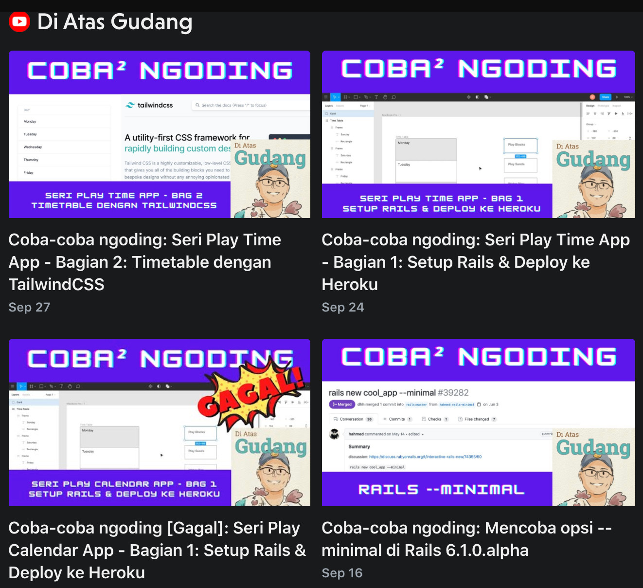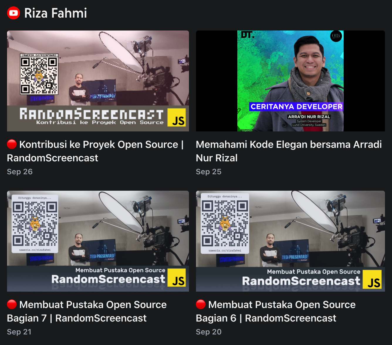 Selain blog, saya juga menambahkan channel YouTube dari Riza Fahmi minggu ini. Ada banyak episode live dan screencast dari Riza Fahmi yang dapat kalian temukan di YouTube. Jika kalian menikmati JavaScript, pastikan untuk menonton YouTube-nya juga selain menikmati podcast-nya di Spotify.
