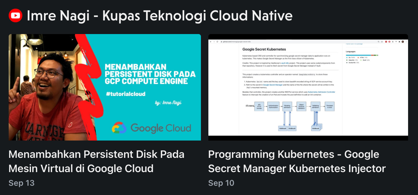 Channel YouTube dari Imre Nagi sudah ditambahkan di Teknologia. Ada pair programming challenge, tutorial Google Cloud dan berbagai talk yang pernah ia bawakan.