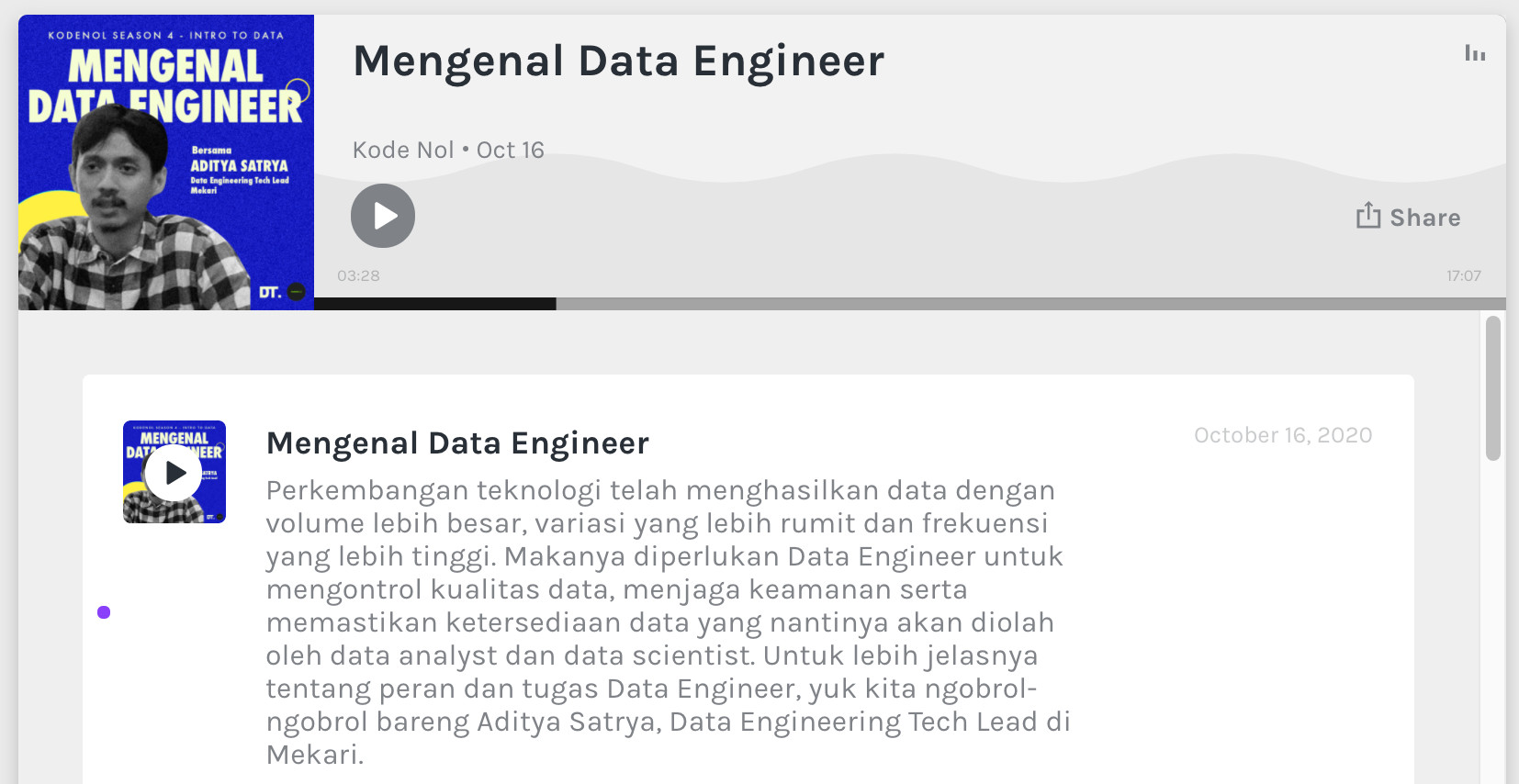 Dalam episode podcast Kode Nol minggu ini ada wawancara dengan Aditya Satrya, Data Engineering Tech Lead dari Mekari mengenai profesi Data Engineer. Menurut saya cukup menarik karena profesi ini menentukan bagaimana bisnis berjalan, termasuk sebagai penentu munculnya potensi unit bisnis baru.