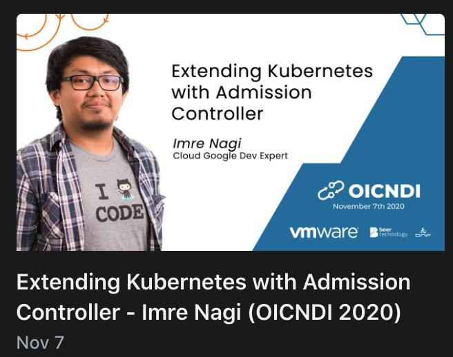 Baru-baru ini ada sebuah acara bernama Open Infrastructure Cloud Native Day Indonesia 2020. Salah satu talk-nya dibawakan oleh Imre mengenai bagaimana memaksa developer untuk mengikuti standar yang sudah ditentukan dengan Kubernetes Admission Controller πͺ
