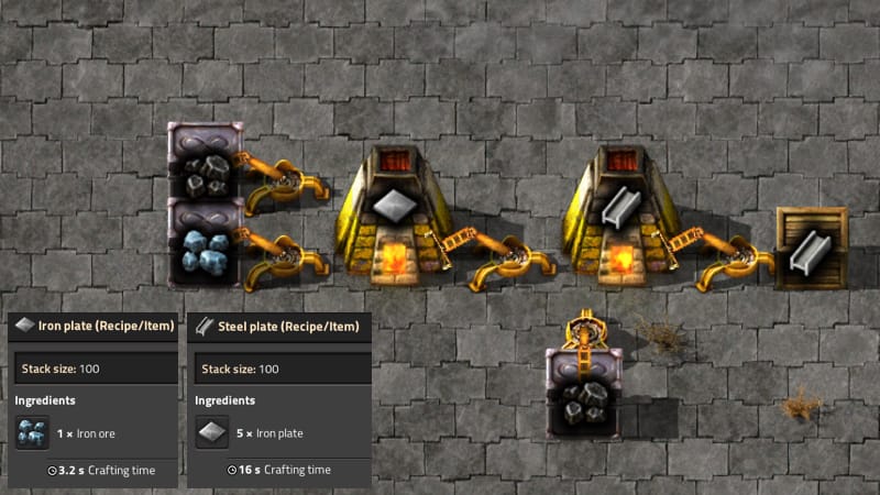 Ini adalah pabrik pembuat baja (Steel) yang sederhana. Sebatang baja dibuat dari 5 lempeng besi (Iron Plate). Lempeng besi dibuat dari sebuah bijih besi (Iron ore). Dan untuk mengaktifkan tungku diperlukan batubara (Coal) sebagai bahan bakarnya.