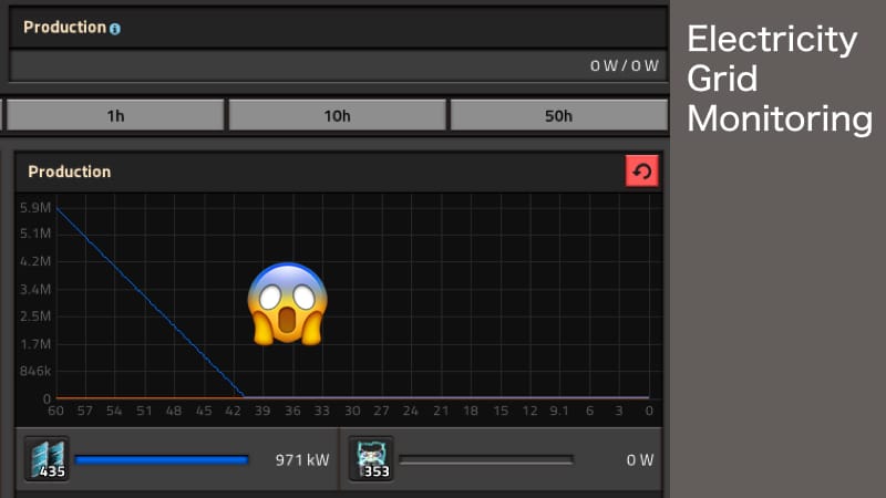 Di Factorio kita bisa melihat output energi yang dikeluarkan beserta kebutuhannya. Jika Demand lebih besar dari Suplai, maka di beberapa area akan muncul indikator merah seperti di atas. Namun apabila suplai energi bergantung pada panel tenaga surya, maka suplai energi bisa mati total begitu cadangan batere sudah habis: