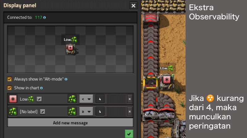 Kamu bisa mengatur logika yang dipakai untuk memunculkan pesan berdasarkan kondisi tertentu. Misalnya dengan memunculkan pesan “Low uranium” apabila konten di atas ban berjalan kurang dari 4 buah.