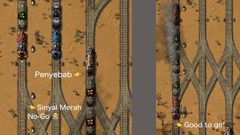 Seringkali software engineer bertindak layaknya detektif. Kemampuan investigatif ini juga banyak dilatih di Factorio. Pada contoh kasus ini, ternyata penyebab berkurangnya suplai uranium adalah akibat kereta yang macet 😄. Setelah ditelusuri, ternyata ada kereta yang menghalangi jalur tersebut sehingga sinyalnya terindikasi merah “no-go”. Saya bisa menjelaskan sendiri mengenai sistem kereta api ini dalam artikel terpisah, namun untuk menyederhanakan solusi ini, saya cukup menjalankan kereta secara manual untuk membebaskan jalur kereta uranium ini. Problem solved!