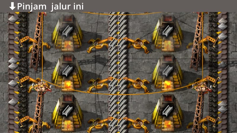 Ini adalah contoh horizontal scaling. Pada dasarnya adalah meningkatkan jumlah tungkunya. Namun untuk tungku tersebut membutuhkan suplai batubara dan bijih besi, jadi materialnya dibawa menggunakan ban berjalan. Ini adalah cara memecahkannya di Factorio. Dalam software engineering, ini artinya menambah jumlah server. Tungku ini ibaratnya sebagai server. User traffic mesti dibagi ke setiap server, sehingga ban berjalan ini ibaratnya sebagai load balancer.