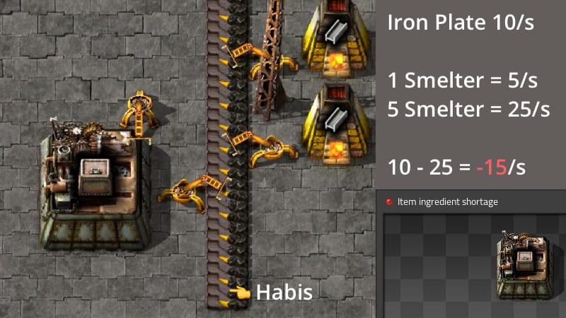 Di Factorio kalian akan sering menjumpai ban berjalan yang “ompong” karena kekurangan material. Tak jarang pemain Factorio akan menghitung-hitung output dari sebuah lini produksi secara manual. Pada bagan di atas saya menghitung ternyata kita kekurangan 15 lempeng besi per detik. Artinya produksi peti tidak akan mendapatkan material yang dibutuhkan. Lebih cepat merangkai Peti sendiri daripada harus menunggu material dari lini produksi ini.