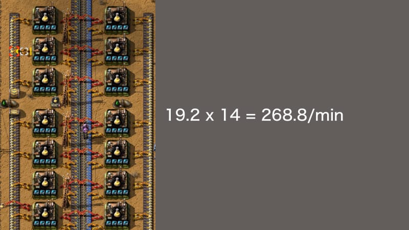 Bandingkan dengan lini produksi berikut yang sudah dioptimasi dengan speed module. Kini kita bisa menghasilkan 19.2 komponen per menit. Belasan kali lipat lebih cepat dari crafting sendiri.